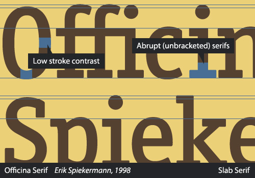 This article wouldn’t be complete without a mention of slab serifs. These are among the easiest to identify because of their very obvious appearance. Originally created for advertising, posters and other large media, slab serifs, alternatively called “Mechanicals” (in VOX-ATypI) and “Égyptiennes” (by Thibaudeau), were the first types expressly designed as display type. Vincent Figgins is credited with the first slab serifs, the earliest specimen dating to 1815, and his work inspired a diversity of critiques variously commending and lambasting the new style.