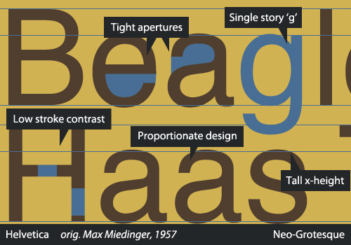 The Neo-Grotesques, also called Transitionals or Realists, include many of the most commonly used sans. They are based on the later Grotesques and take the design of the sans-serif to a new level with their careful construction and aesthetics. They are much more refined than the Grotesques, during which period type designers were still feeling their way around the new style; thus, the Neo-Grotesques lose many of the awkward curves and idiosyncrasies that are common in earlier sans serifs. You’ll see much less variation in line weight, and most often a single-story “g.”