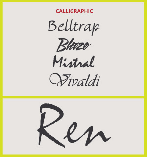 These scripts mimic calligraphic writing. They can be connecting or non-connecting in design. Many appear to have been written with a flat-tipped writing instrument.