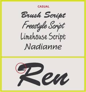 These typefaces are designed to suggest informality, as if they were written quickly. Many times they appear to have been drawn with a brush. Normally, character strokes connect one letter to the next.